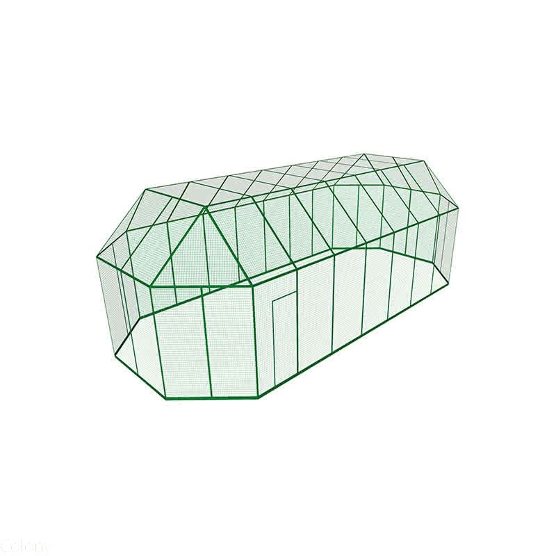 Dimensions : . Longueur : 930 cm . Largeur : 430 cm . Hauteur : 330 cm . Grillage : maille de 12 mm x 25 mm . Epaisseur du grillage : 1,8 mm . Panneau latéraux : 220 x 100 cm . Panneau toit incliné : 160 x 100 cm